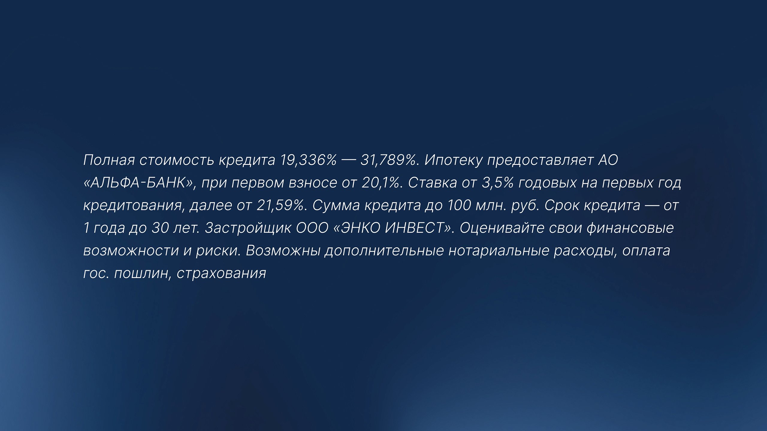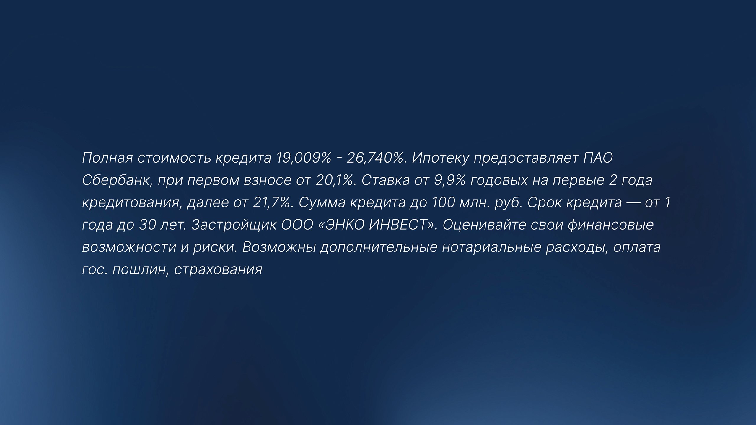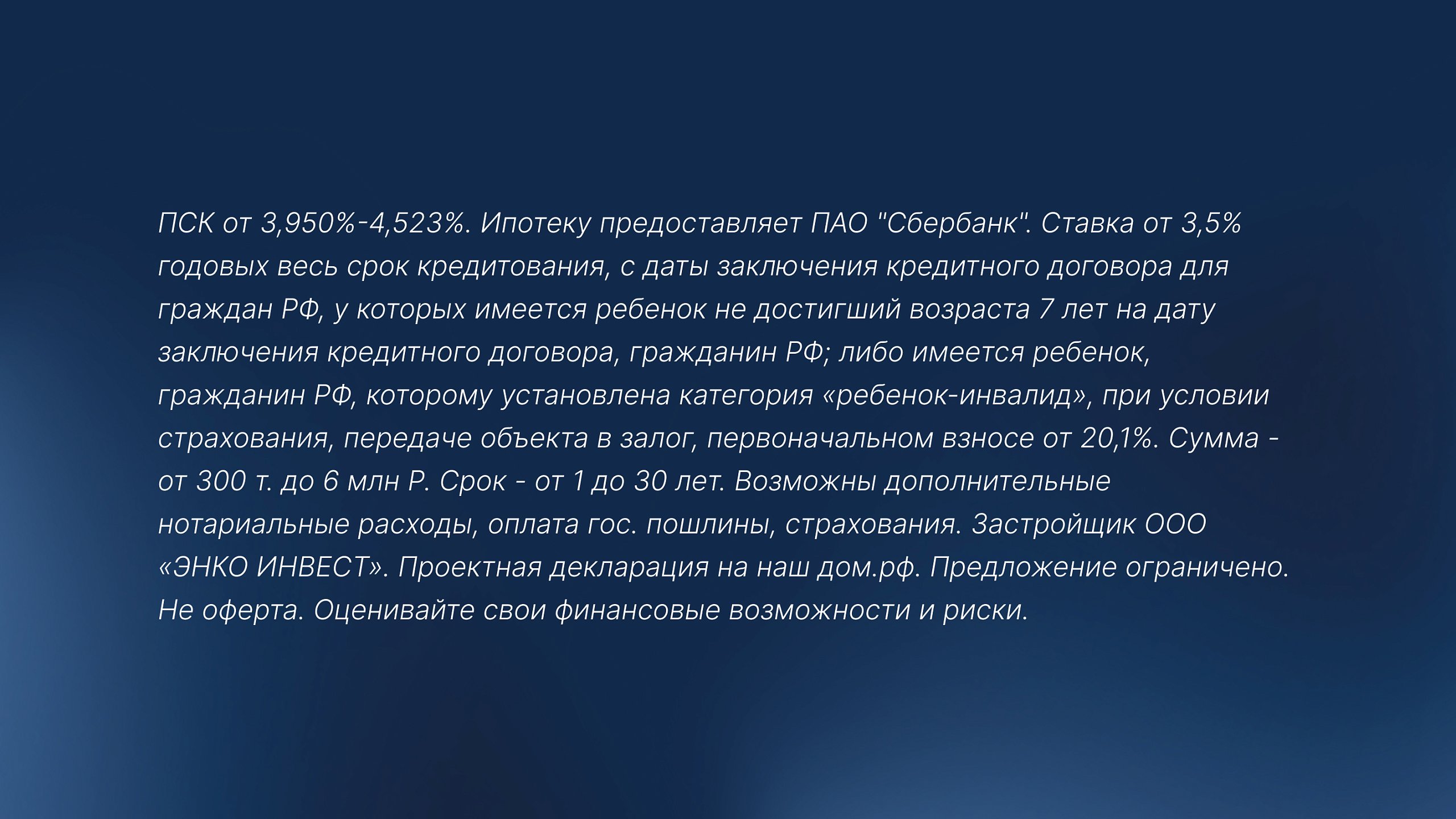 Если вы планируете покупку без привлечения банка, в ЭНКО действует рассрочка с первоначальным взносом от 15% и сроком до 2027 года.