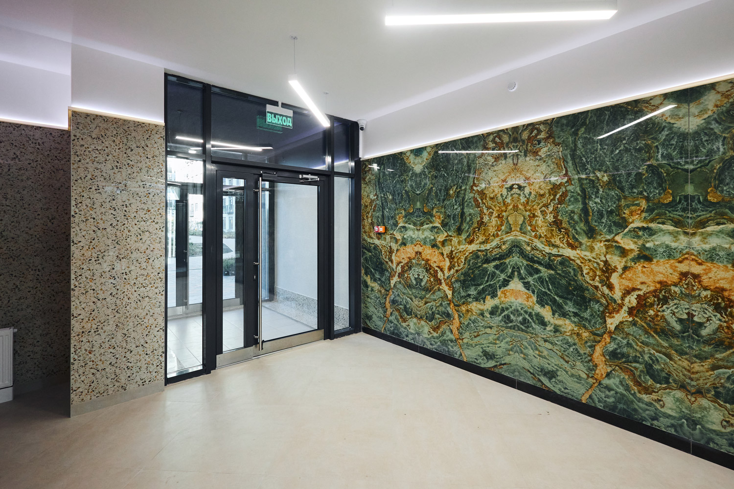 Стилистика подъездов продолжает концепцию Беринга, вдохновлённого Камчаткой: сдержанный,