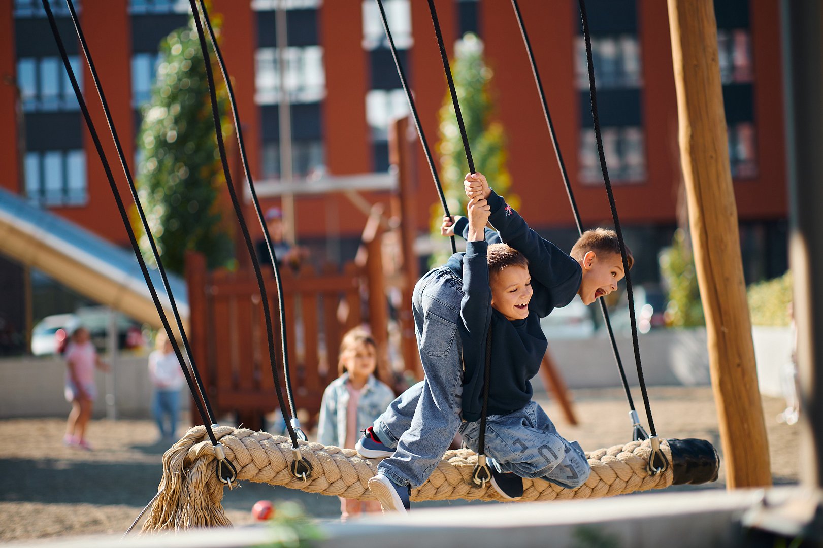 Разнообразные детские площадки, на которых можно придумать бесконечное количество игр. Играть с папой в футбол, гулять
