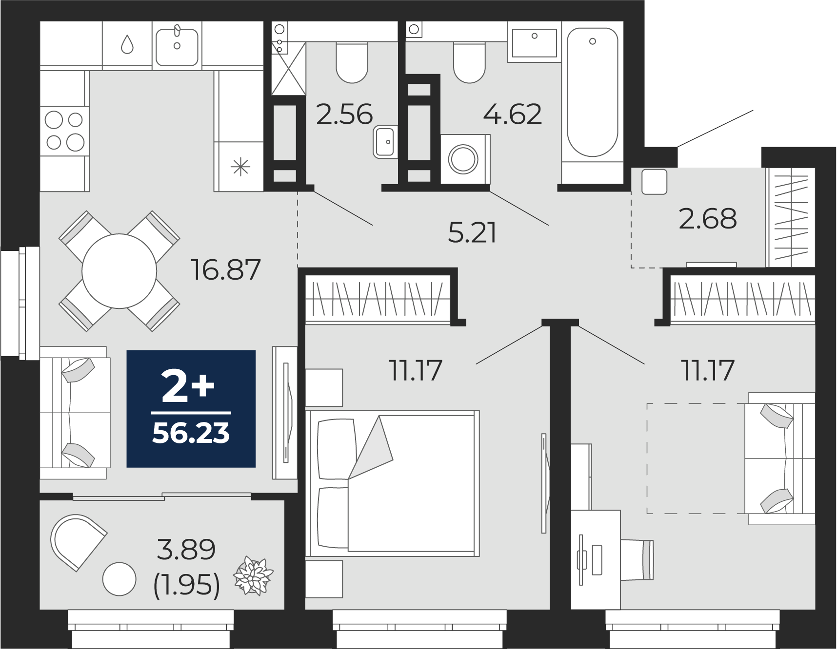 Квартира № 61, 2-комнатная, 56.23 кв. м, 13 этаж