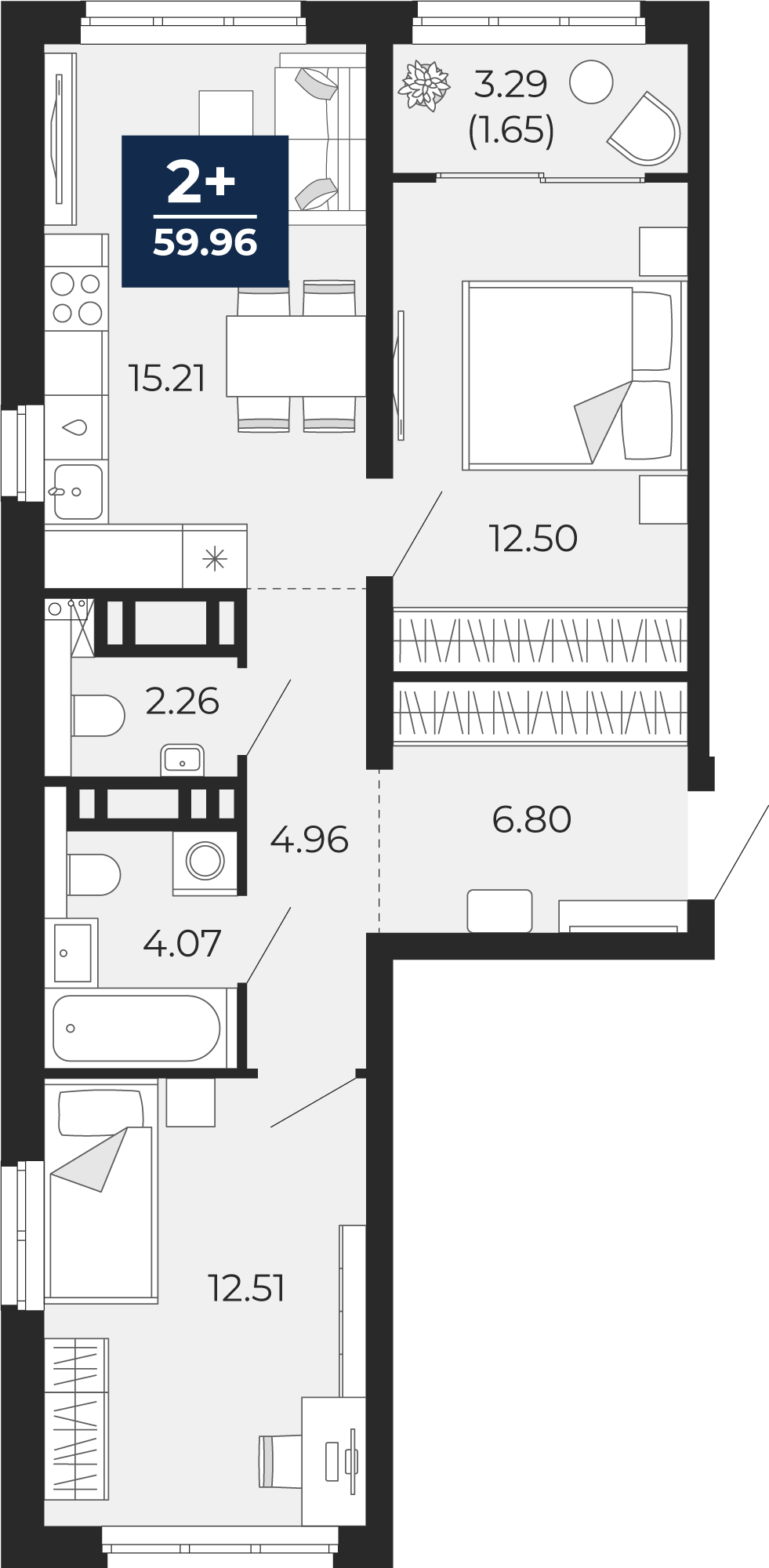 2 комнатная квартира Стандарт, площадью: 59,96 кв.м. №139, балконы/лоджии  3,29