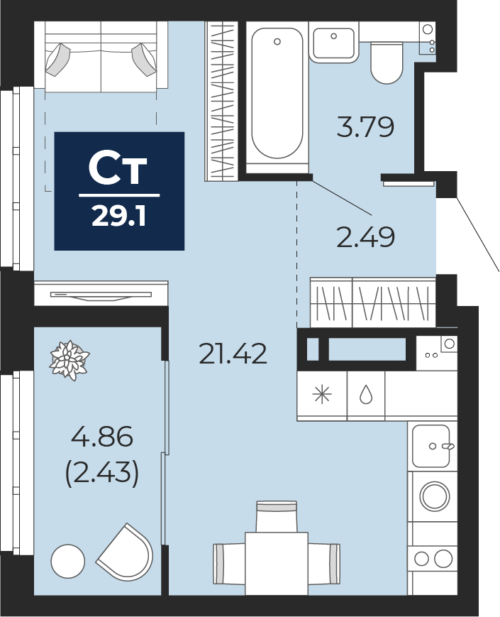 1 комнатная квартира Студия, площадью: 29,1 кв.м. №144, балконы/лоджии  4,86