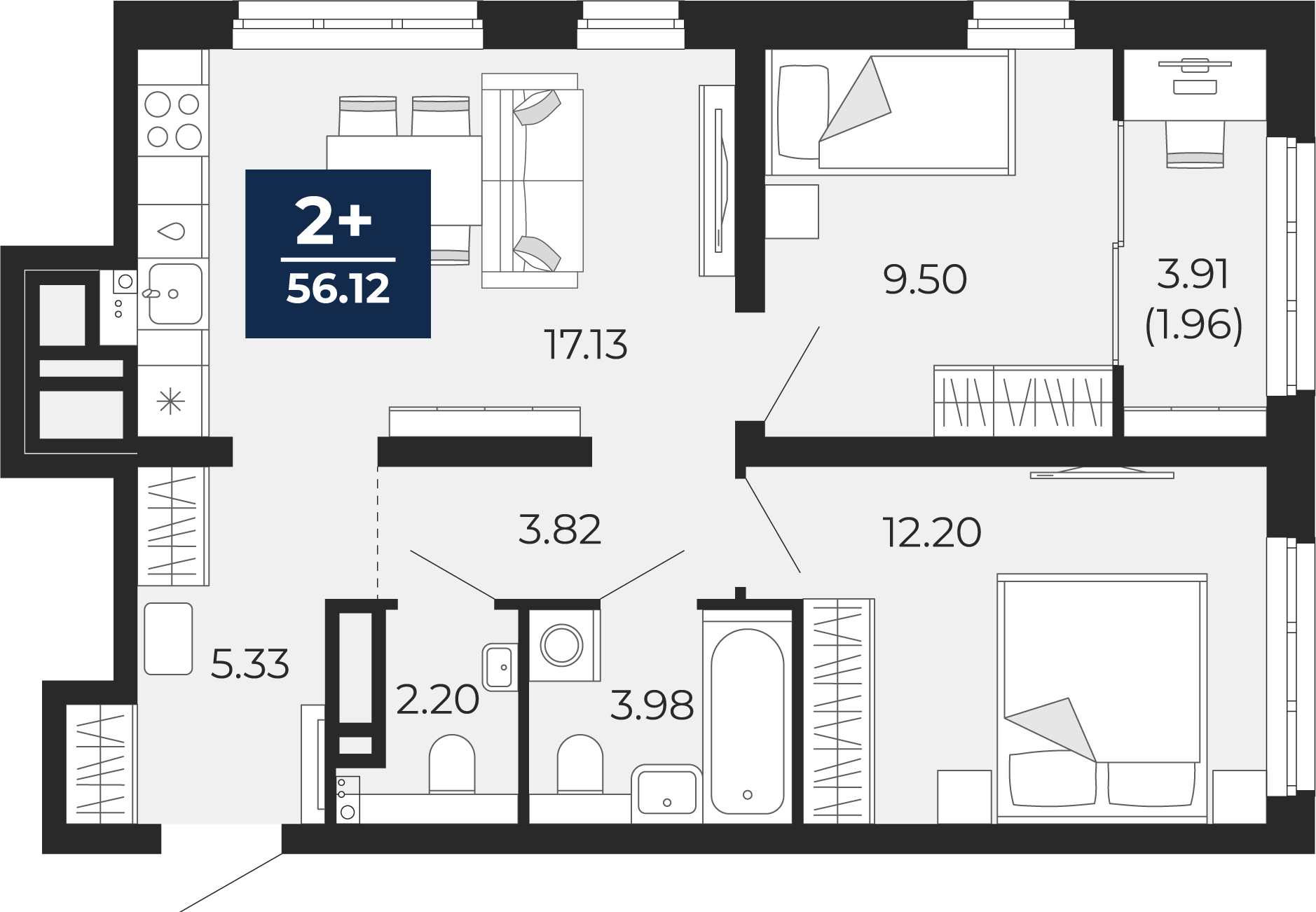 Квартира № 203, 2-комнатная, 56.12 кв. м, 21 этаж