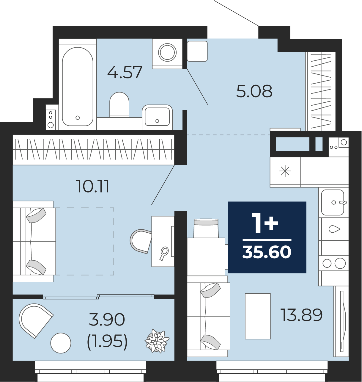 1 комнатная квартира Стандарт, площадью: 35,6 кв.м. №271, балконы/лоджии  3,90