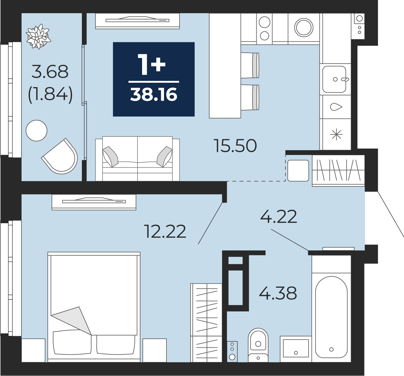 1 комнатная квартира Стандарт, площадью: 38,16 кв.м. №110, балконы/лоджии  3,68