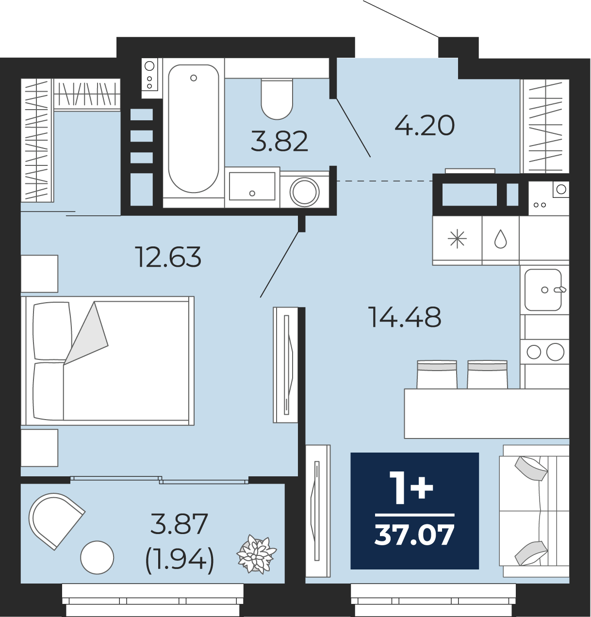 1 комнатная квартира Стандарт, площадью: 37,07 кв.м. №174, балконы/лоджии  3,87