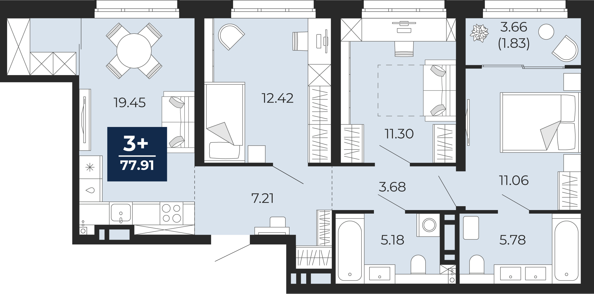 3 комнатная квартира Стандарт, площадью: 77,91 кв.м. №179, балконы/лоджии  3,66