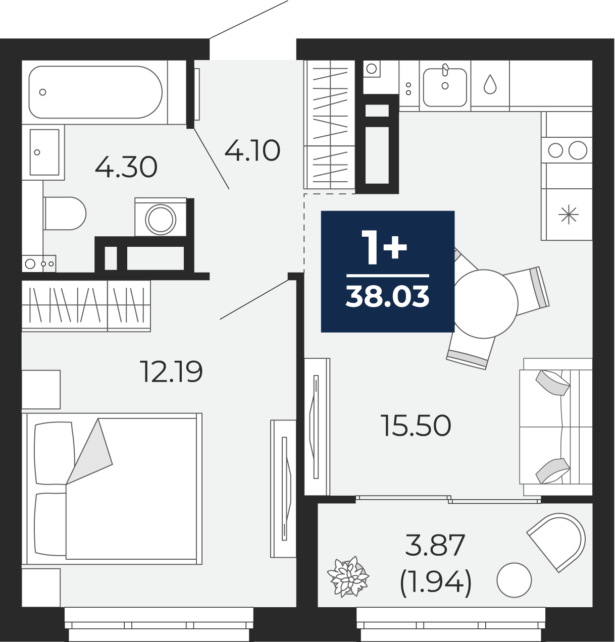 1 комнатная квартира Стандарт, площадью: 38,03 кв.м. №189, балконы/лоджии  3,87