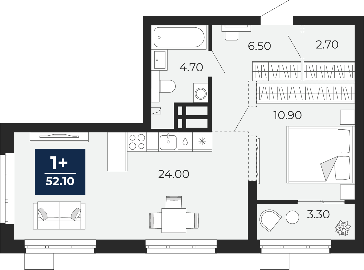 1-комнатная, 52.1 м2