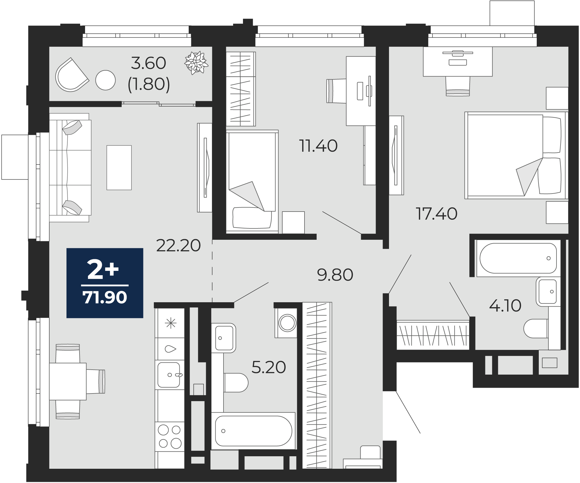 Квартира № 106, 2-комнатная, 71.9 кв. м, 3 этаж