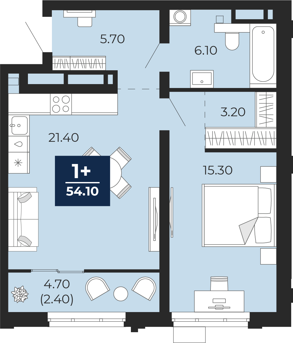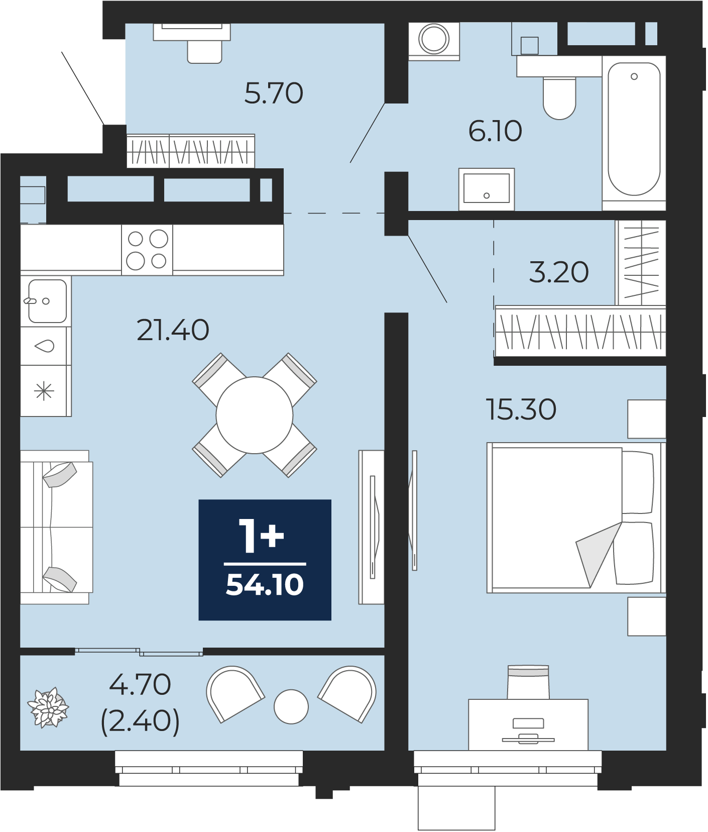1 комнатная квартира Кухня-гостиная, площадью: 54,1 кв.м. №116, балконы/лоджии  4,70(Н)