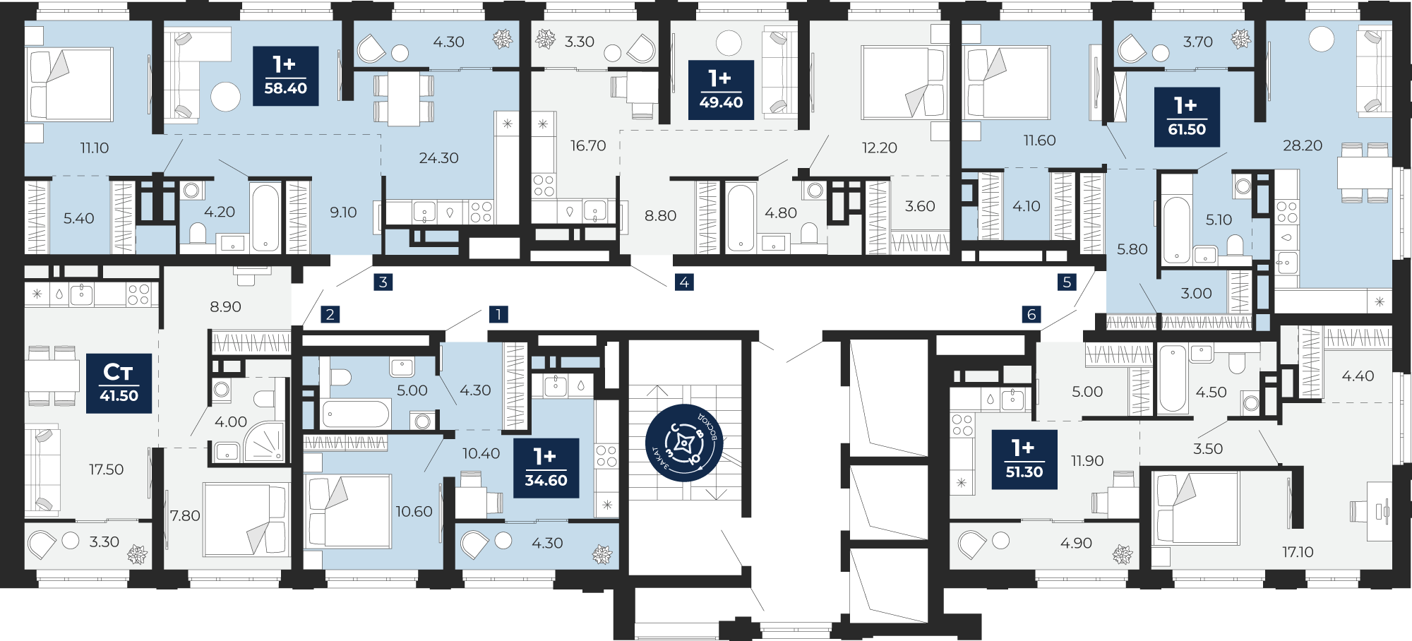 1 комнатная квартира Студия, площадью: 39,9 кв.м. №352, балконы/лоджии  3,30(Н)