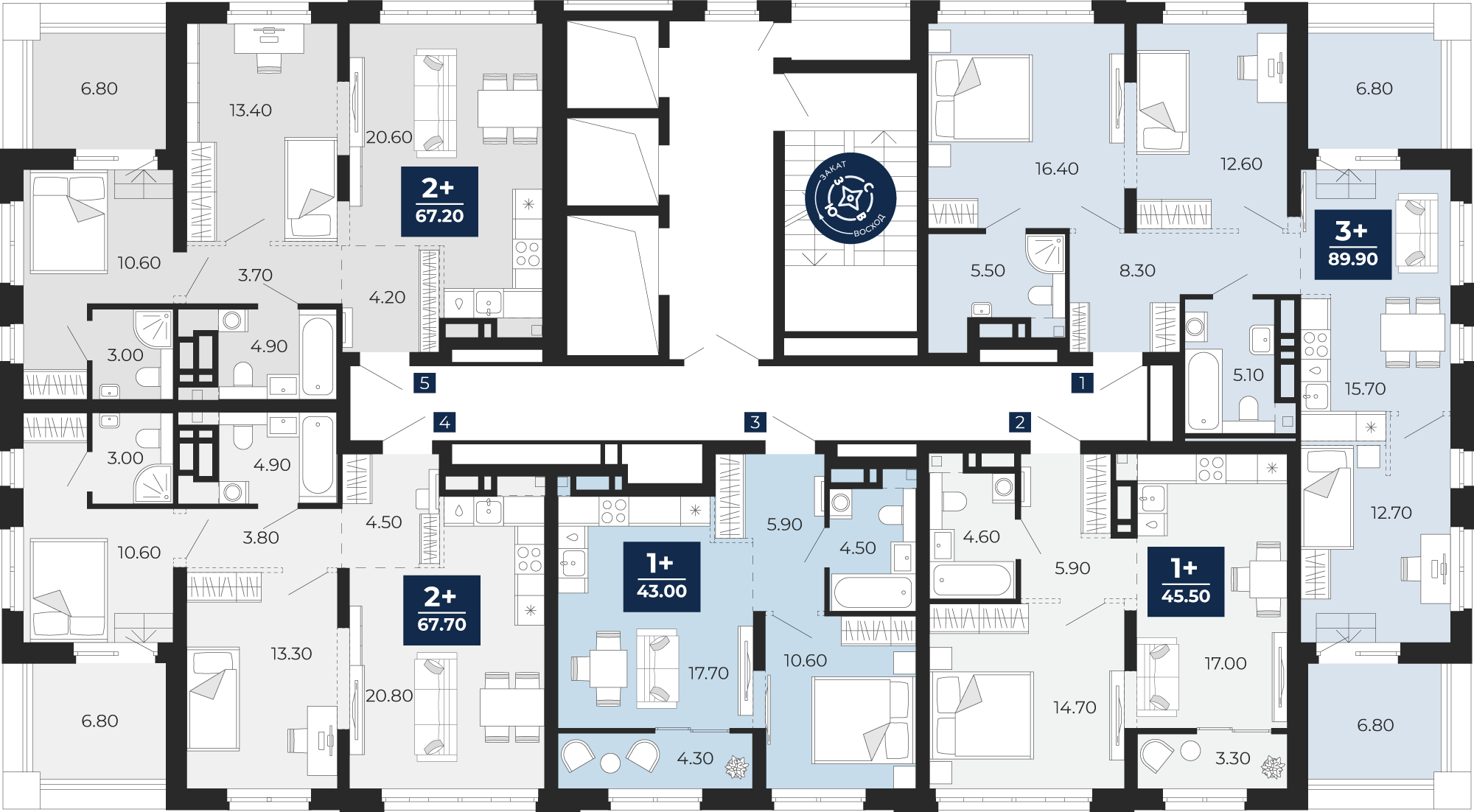 1 комнатная квартира Кухня-гостиная, площадью: 43,9 кв.м. №413, балконы/лоджии  3,30(Н)