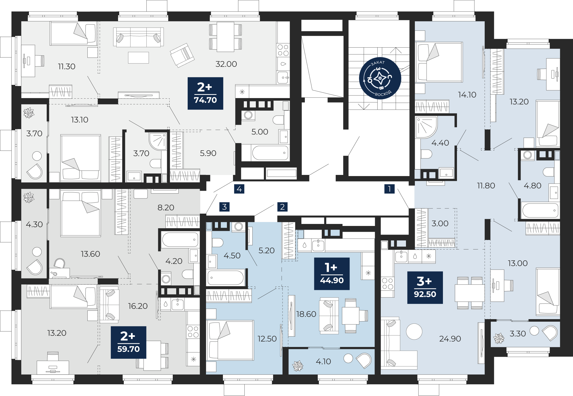 1 комнатная квартира Кухня-гостиная, площадью: 42,9 кв.м. №444, балконы/лоджии  4,10(Н)