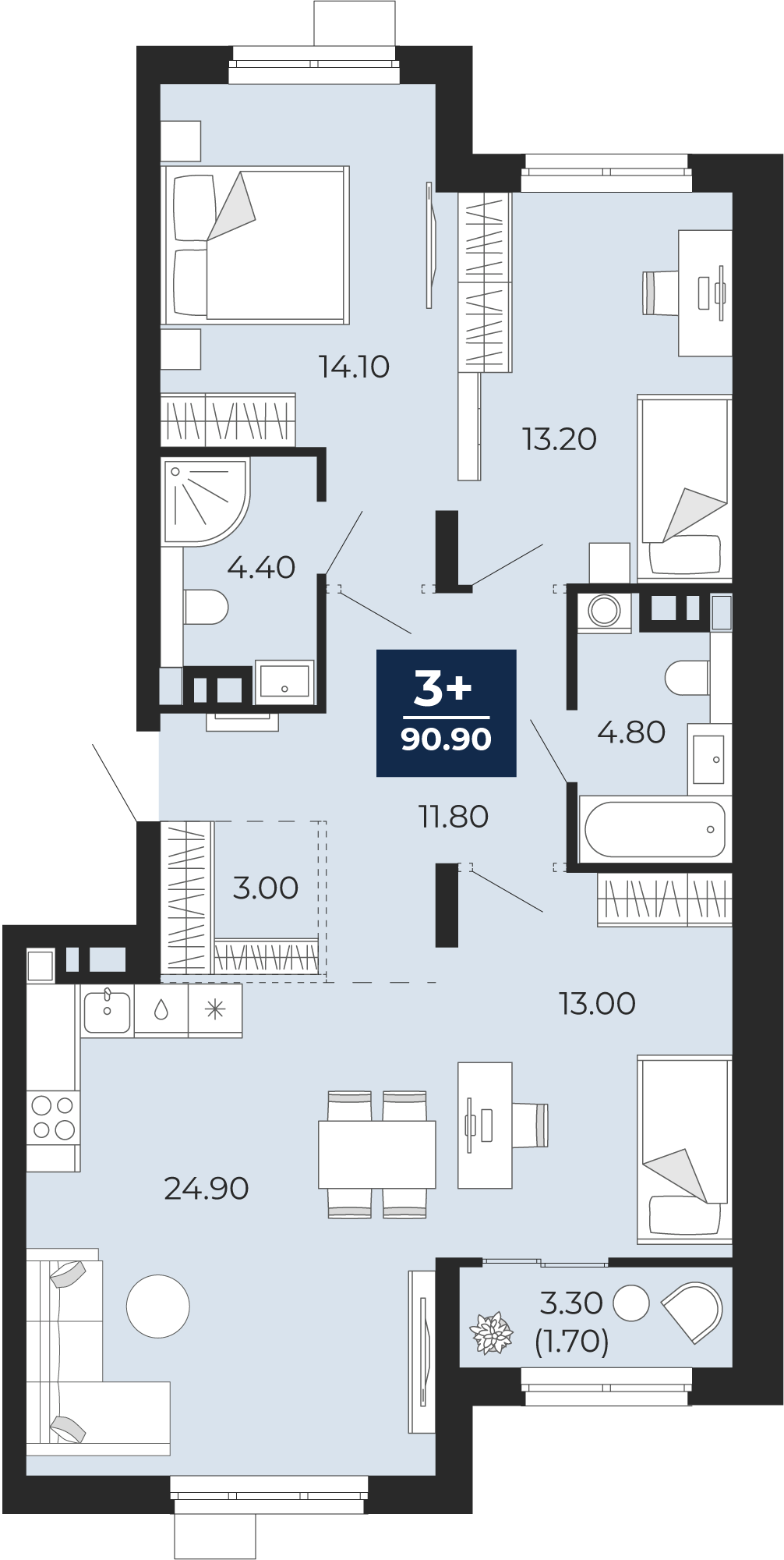 3 комнатная квартира Кухня-гостиная, площадью: 90,9 кв.м. №447, балконы/лоджии  3,30(Н)
