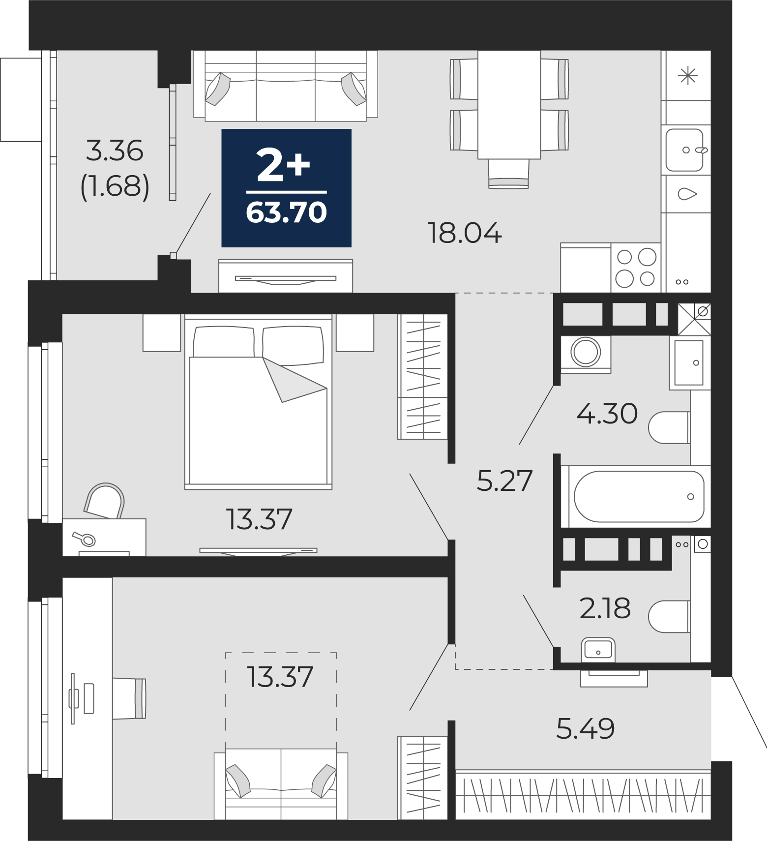 2 комнатная квартира Стандарт, площадью: 63,68 кв.м. №71, балконы/лоджии  3,31
