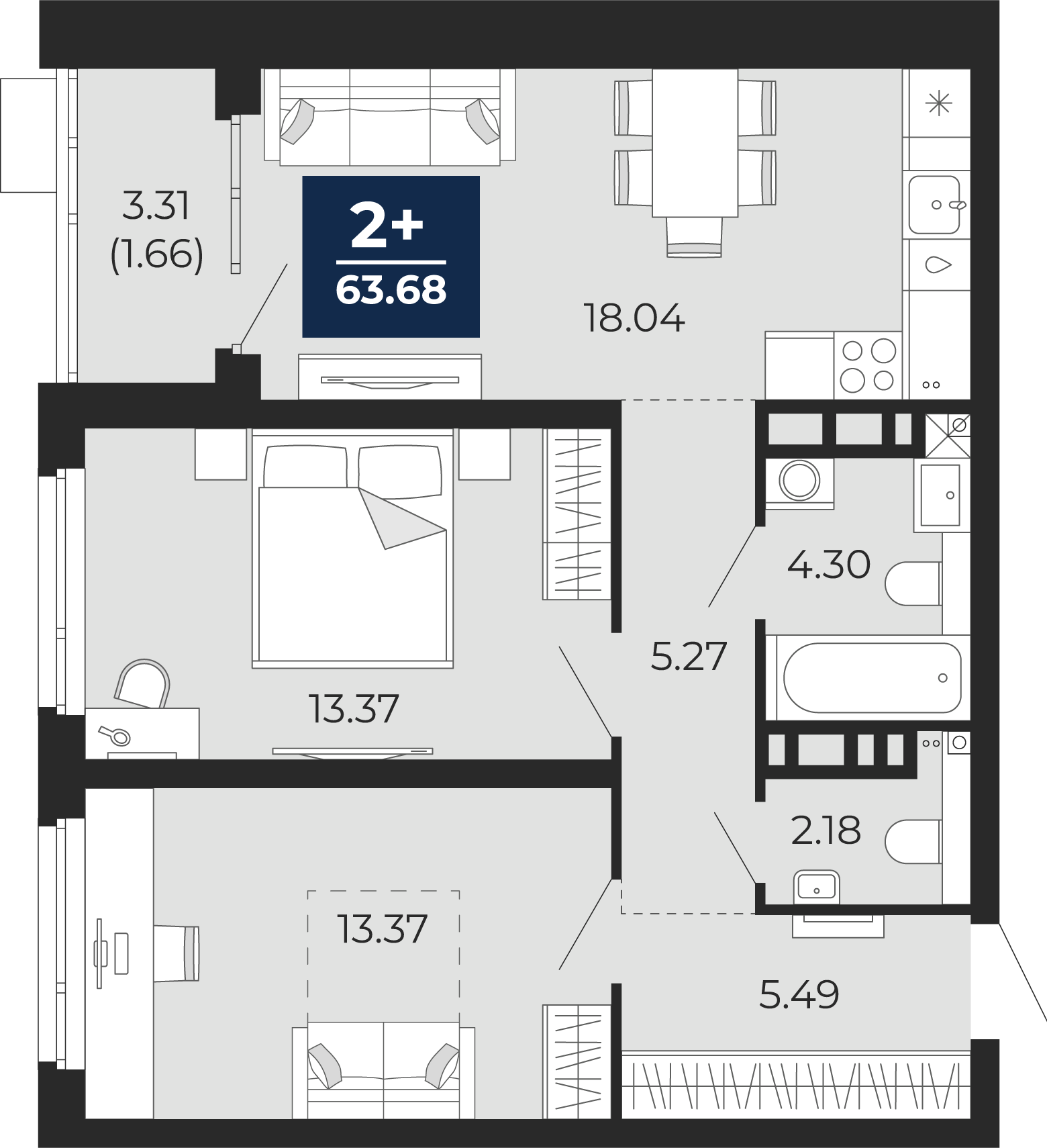 2 комнатная квартира Стандарт, площадью: 63,68 кв.м. №79, балконы/лоджии  3,31