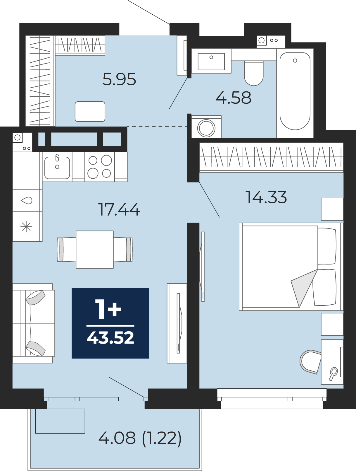 1 комнатная квартира Стандарт, площадью: 43,52 кв.м. №184, балконы/лоджии 4,08(Н)