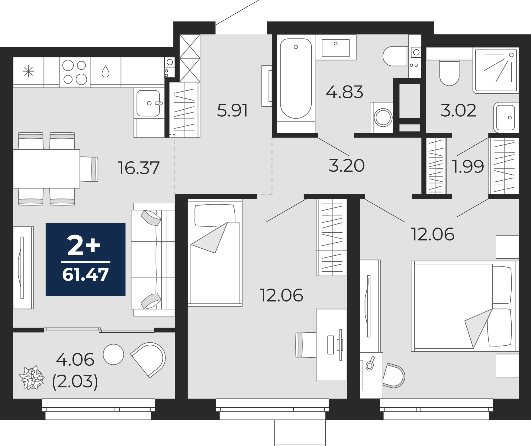 2 комнатная квартира Стандарт, площадью: 61,47 кв.м. №201, балконы/лоджии  4,06