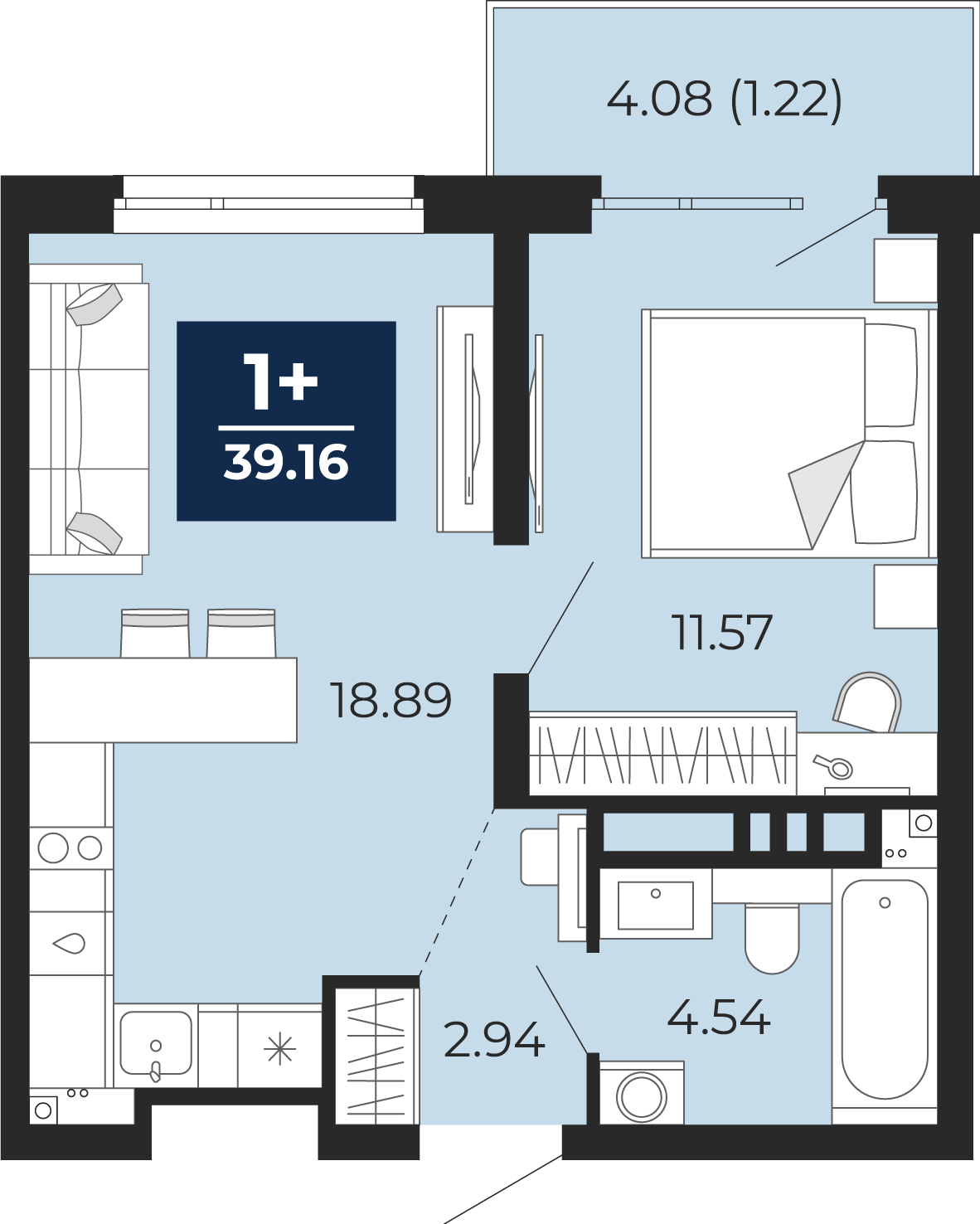 1 комнатная квартира Стандарт, площадью: 39,16 кв.м. №12, балконы/лоджии 4,08(Н)