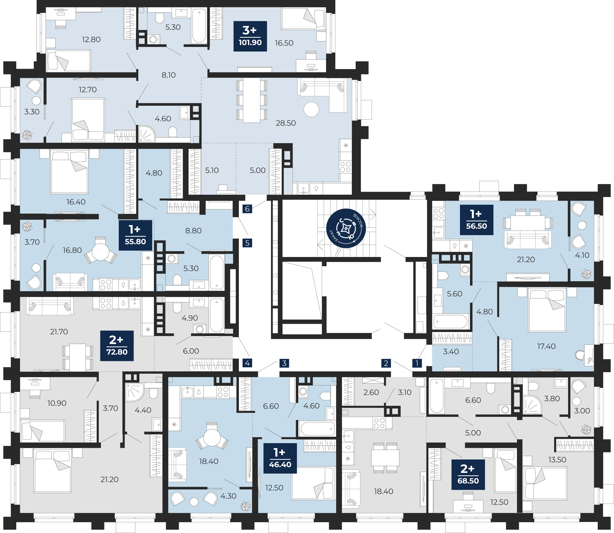 Квартира № 11, 1-комнатная, 55.8 кв. м, 3 этаж