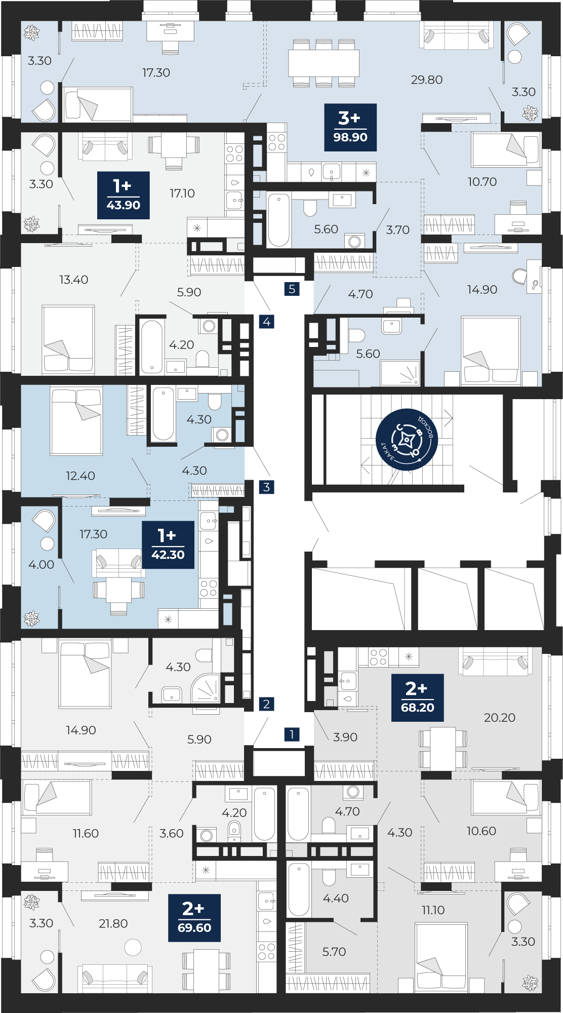 1 комнатная квартира Кухня-гостиная, площадью: 42,3 кв.м. №62, балконы/лоджии  3,30