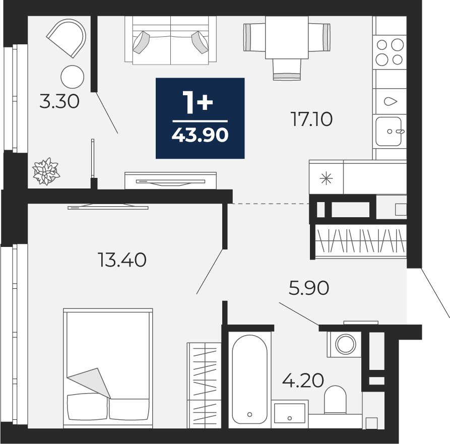 1-комнатная, 43.9 м2