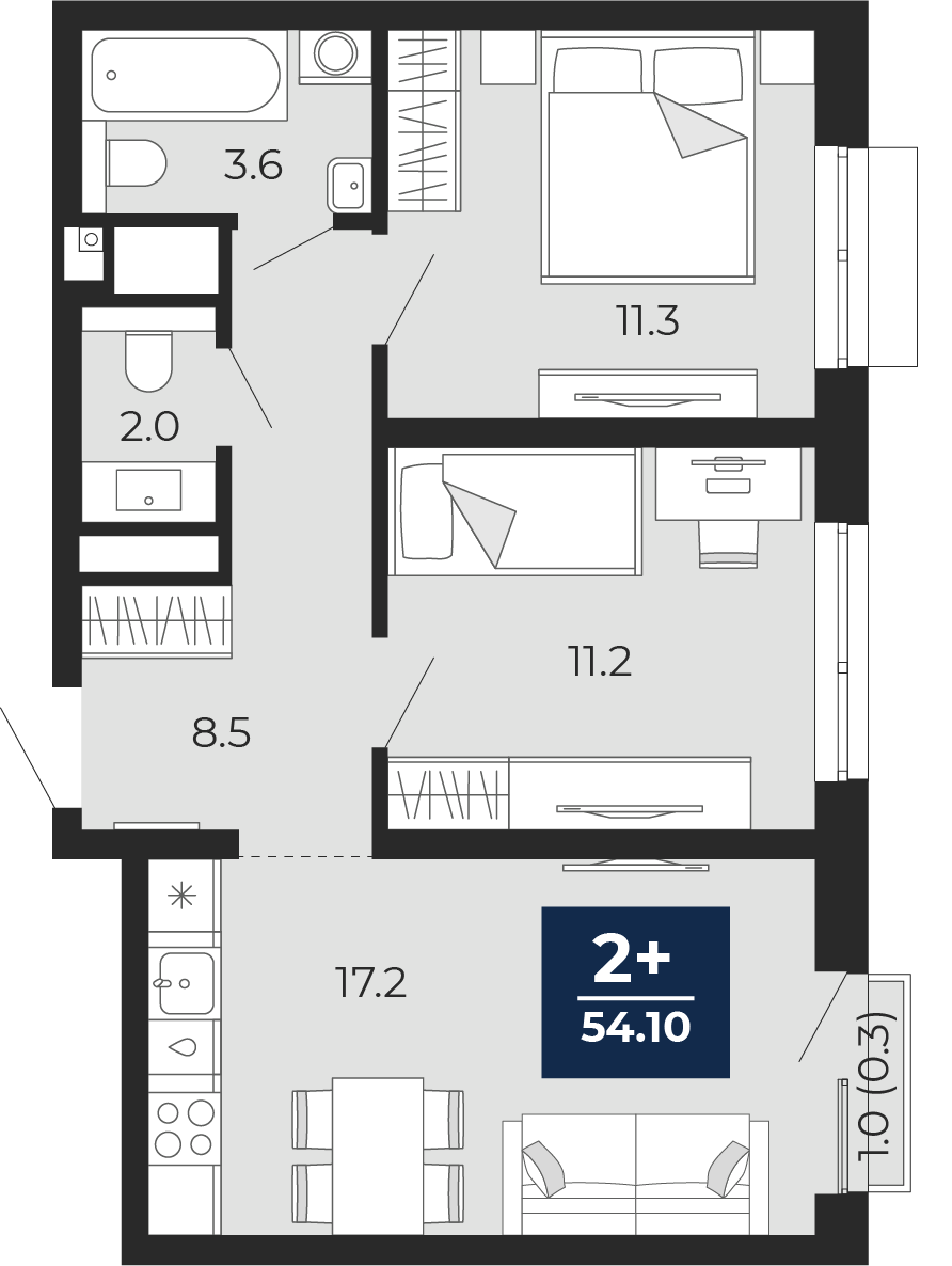 Квартира № 98, 2-комнатная, 54.1 кв. м, 14 этаж