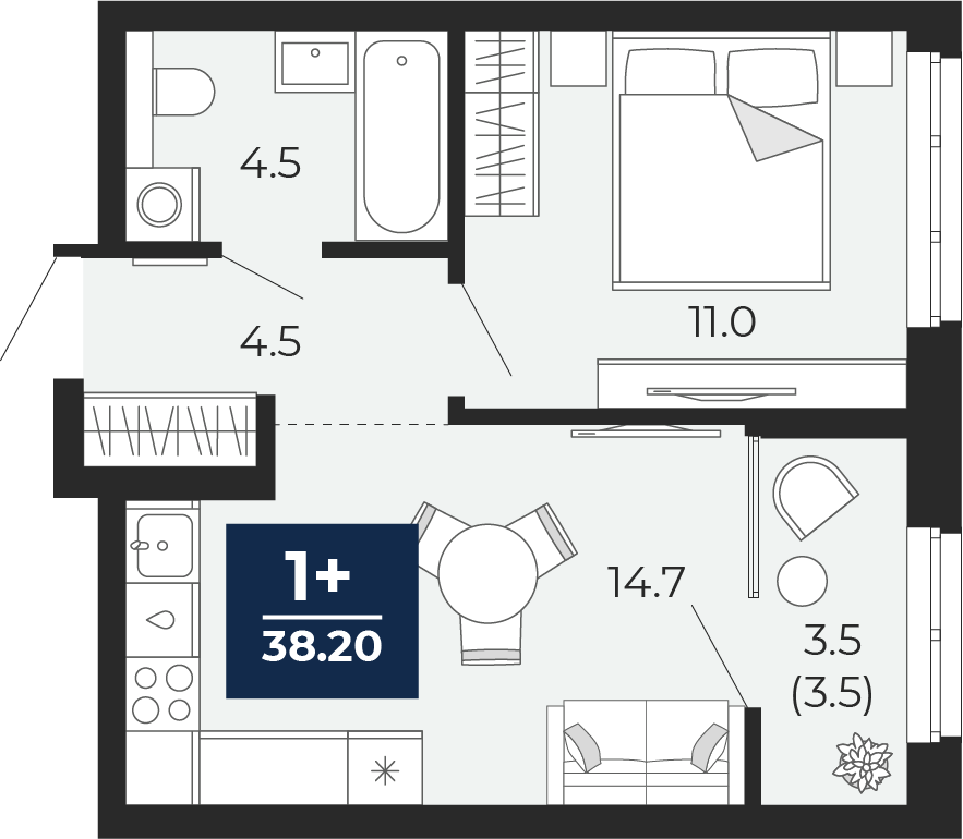 1 комнатная квартира Стандарт, площадью: 38,2 кв.м. №90, балконы/лоджии