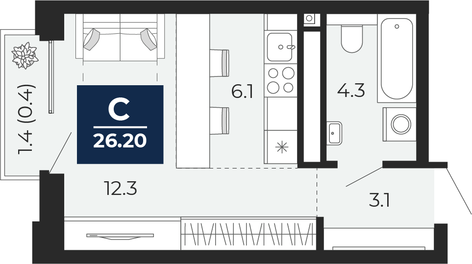 1 комнатная квартира Студия, площадью: 26,2 кв.м. №95, балконы/лоджии 1,40(Н)