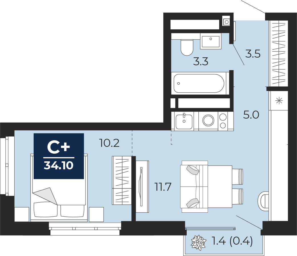 1 комнатная квартира Студия, площадью: 34,1 кв.м. №59, балконы/лоджии 1,40(Н)