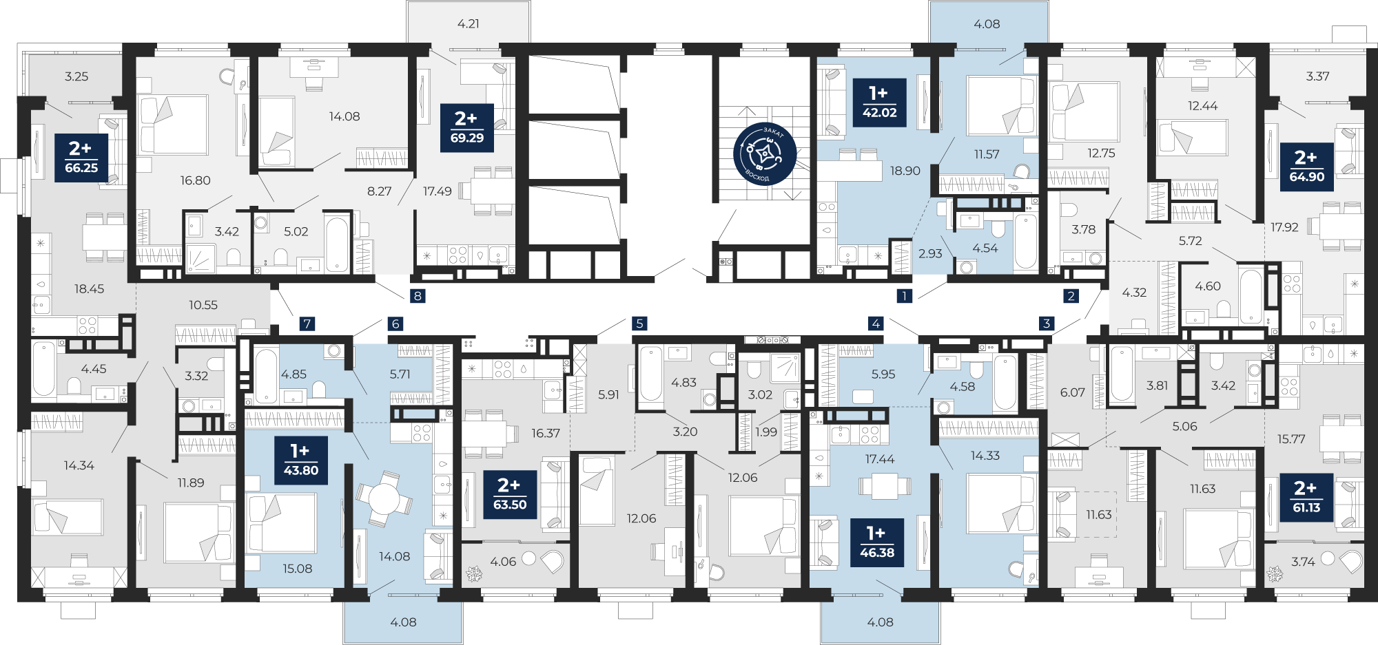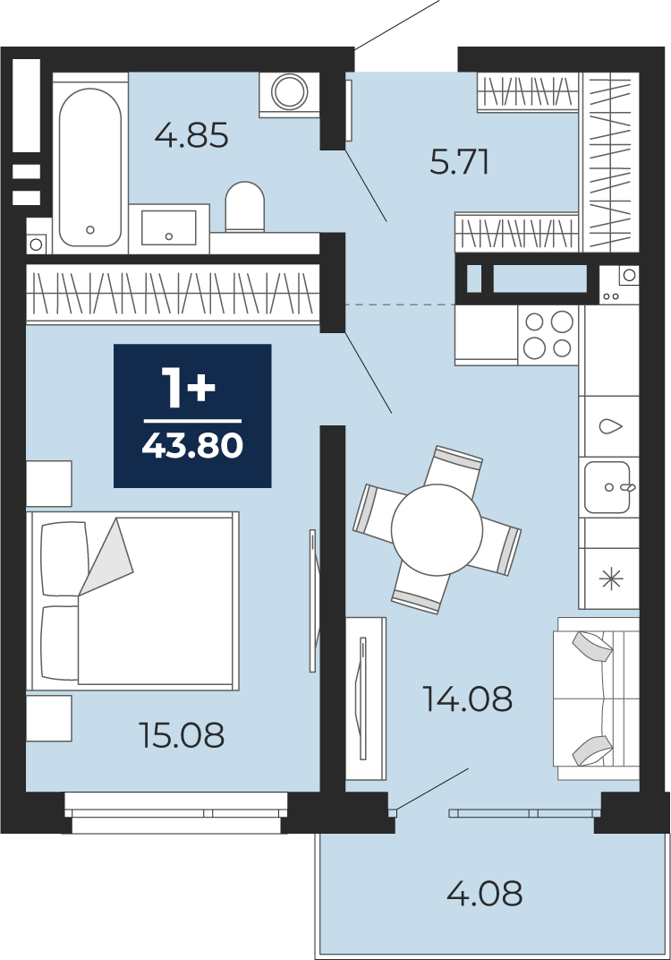 Квартира № 9, 1-комнатная, 43.8 кв. м, 2 этаж