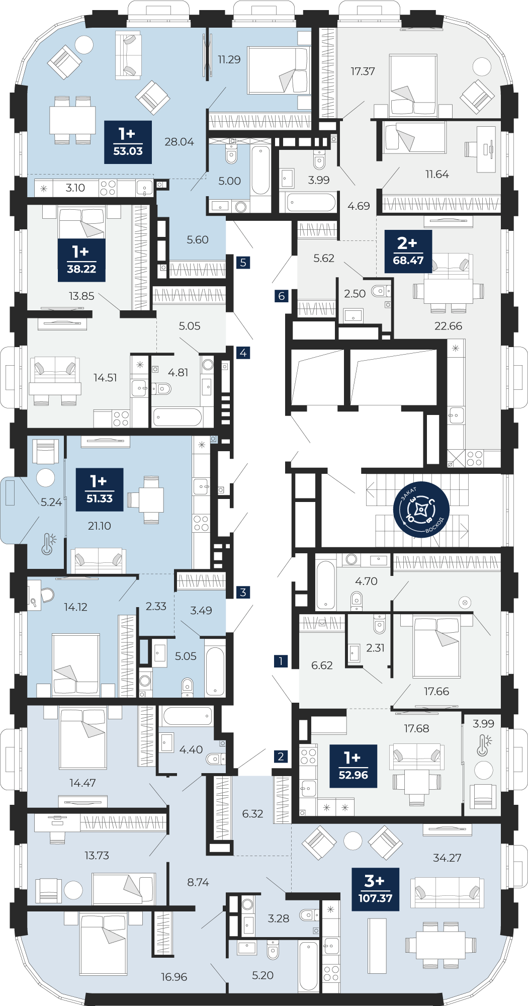 Квартира № 227, 3-комнатная, 107.37 кв. м, 2 этаж