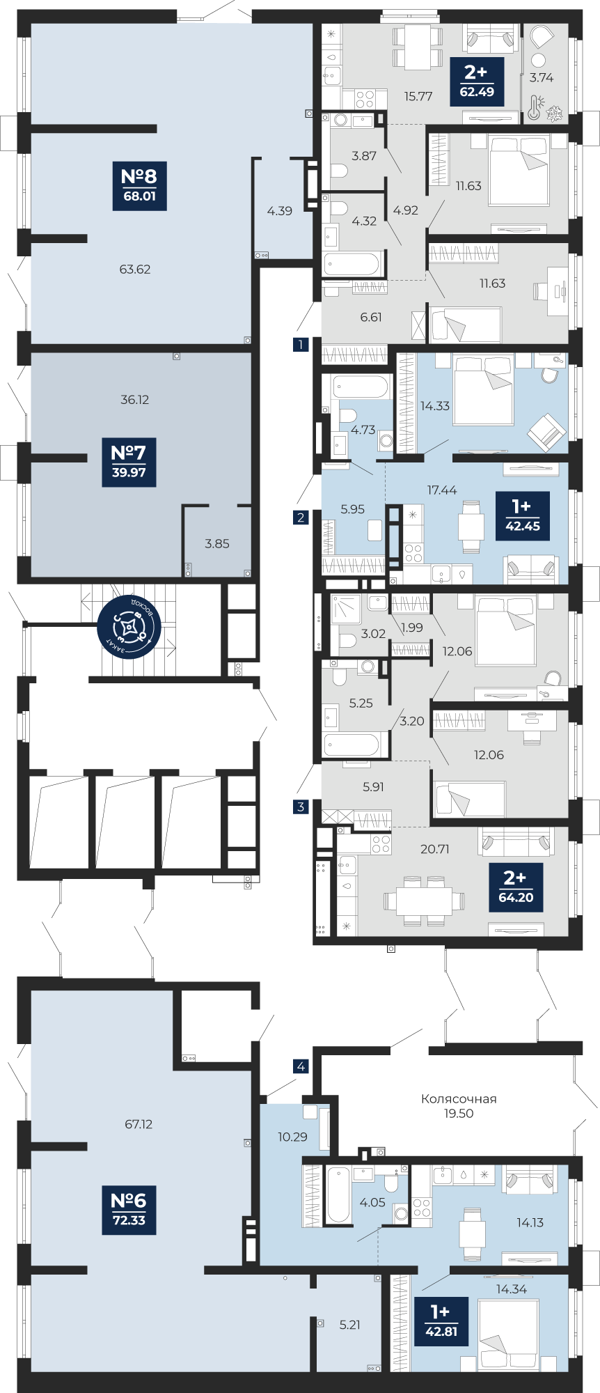 Квартира № 90, 1-комнатная, 42.45 кв. м, 1 этаж