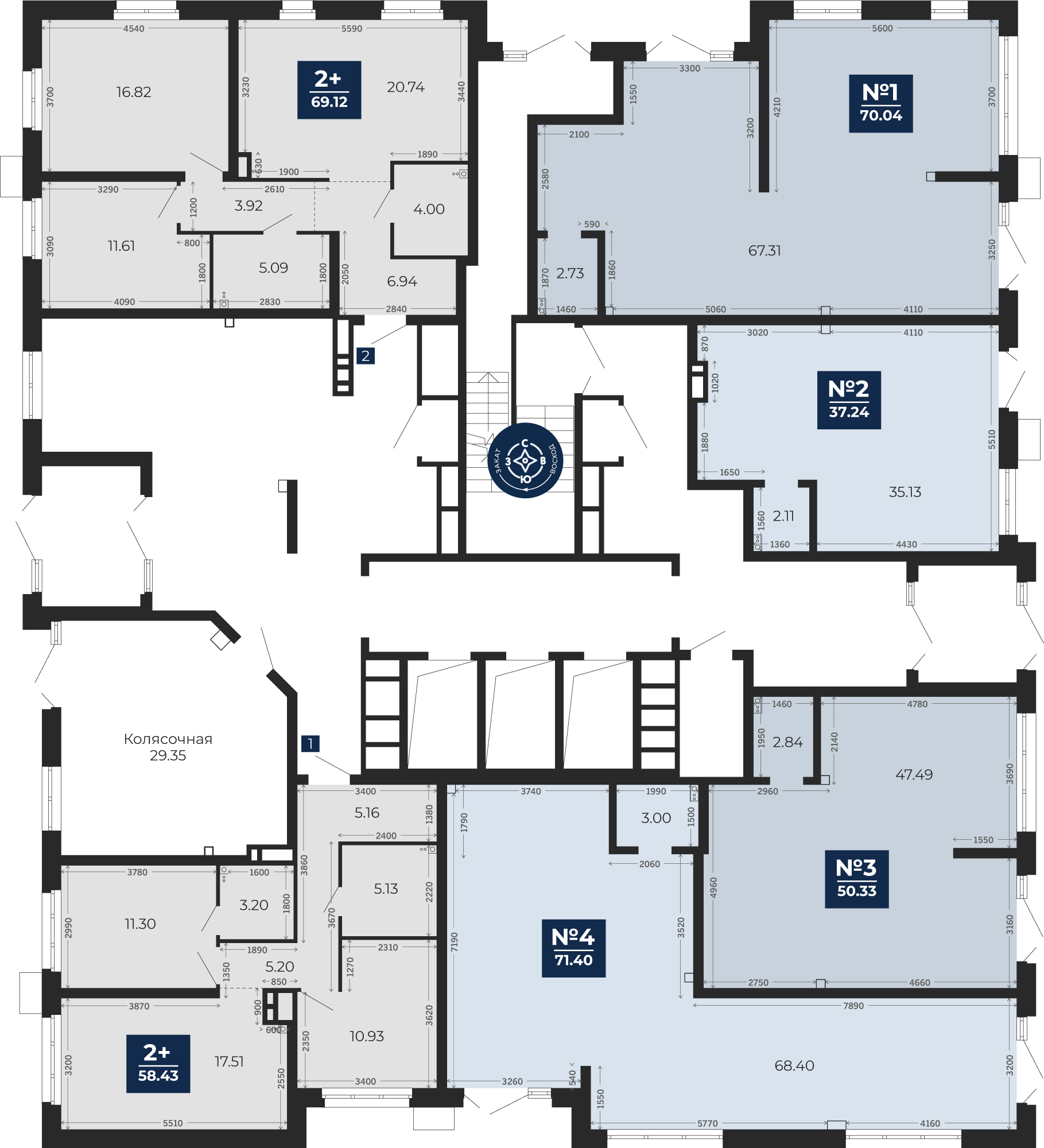 Квартира № 1, 2-комнатная, 58.43 кв. м, 1 этаж