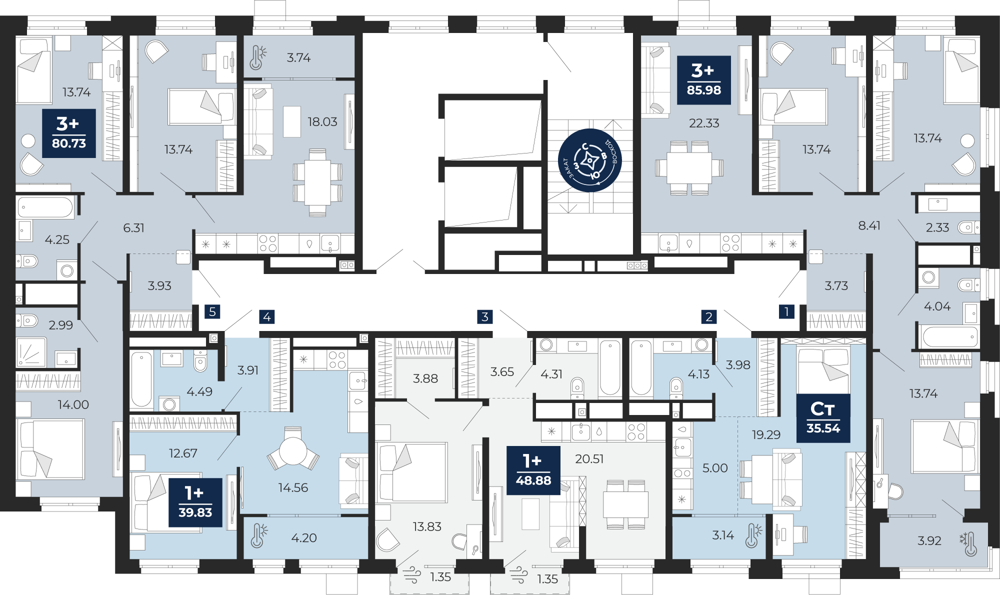 Квартира № 86, Студия, 35.54 кв. м, 6 этаж